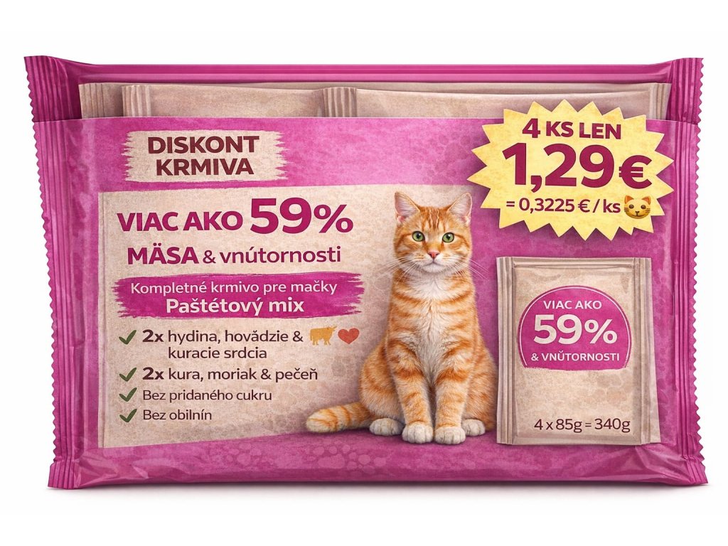 🐾 Paštétový mix pre mačky 4x85g – viac ako 59 % mäsa