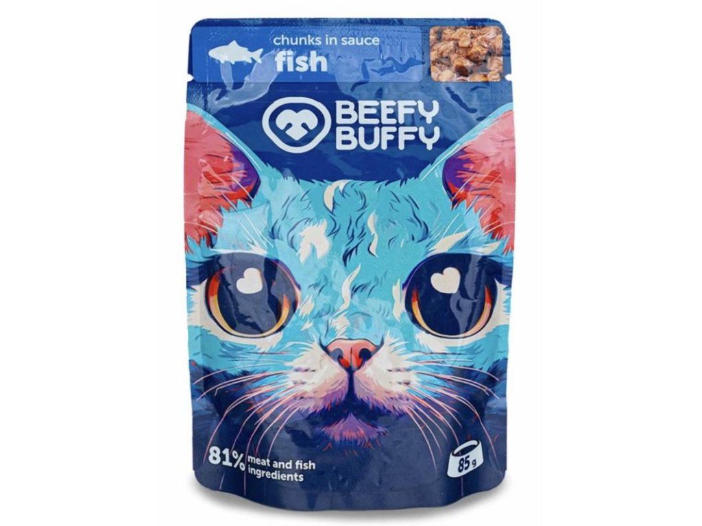 mäso a živočíšne produkty min.81 % v kusoch (kuracie mäso 64 %, rybacie mäso 17 %), obilniny