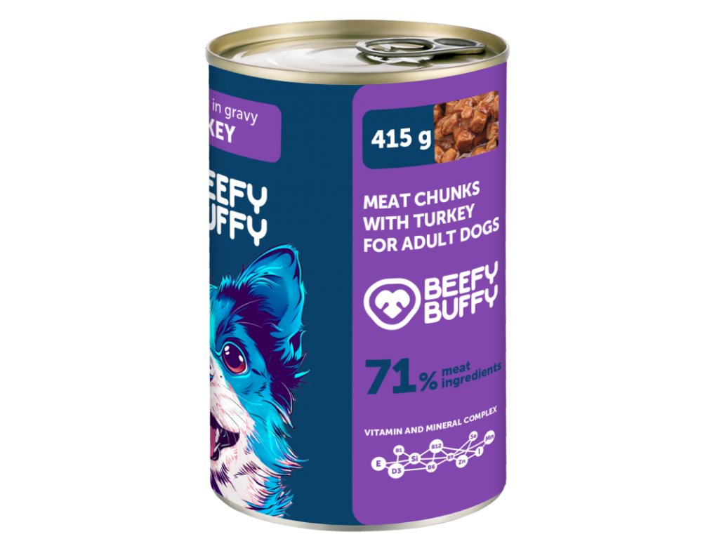 BEEFY BUFFY - Mäsové morčacie kúsočky v omáčke pre psy 415g