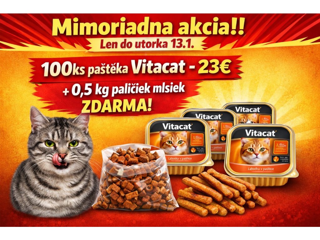 🐱 AKČNÝ BALÍK PRE MAČKY – Vitacat paštékaMimoriadna akcia – len do utorka 13.1.!Výhodný balík pre všetkých milovníkov mačiek 🐾Zásob sa kvalitnou paštétou a poteš svojho mačacieho parťáka aj chutnou odmenou zdarma!✔️ Balík obsahuje:100 ks mačacia paštétka Vitacat0,5 kg paličiek – mlsiek ZDARMA💰 Cena balíka:23 €🎁 Skvelá voľba pre domácnosti s viacerými mačkami, chovateľov alebo ako poriadna zásoba na dlhšie obdobie.⏰ Akcia platí len do 13.1. alebo do vypredania zásob!