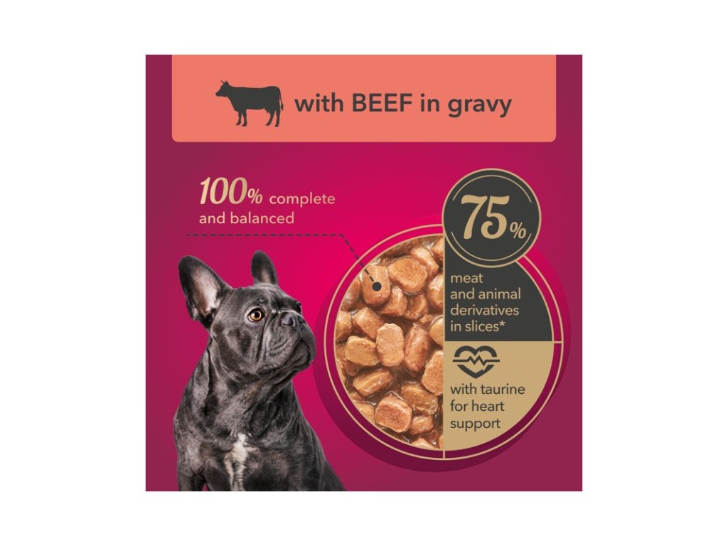 Zloženie: 75 % mäso a živočíšne produkty v plátkoch (4 % hovädzie mäso), obilniny, ryby a rybie produkty, minerály, produkty rastlinného pôvodu.